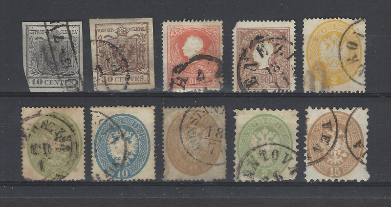 LOMBARDY-VENETIA, #3 // 24, Ten Diff. Stamps, 1850-64 Issues, Used, Mixed Cond., Some Small Faults, Mostly F-VF, Inventory Included, SCV is $1,090.00 (Image)