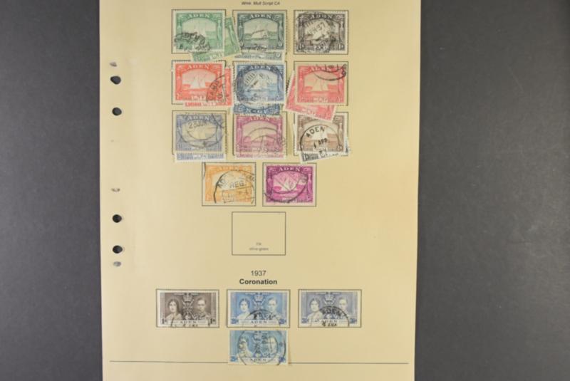 Aden, */used collection 1937–1964 on leaves. Dhows to 5 R, KGVI complete except RSW with loads of extra stamps. QEII to 20 s (1) mint * mixed mint and used in the set. Seiyun mostly used with RSW mint, Mukalla with RSW mint and some other high values mint. Mostly fine quality (150–200) 7 more images are available at www.philea.se (Image1)