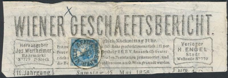 Austria, Mi 6 brevstycke, 1851 Newspaper stamp (0.6 Kr) blue. On piece of newspaper, superb cancel ZEITUNGS-EXPED:WIEN 15.5. (Image1)