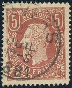 Belgium, Michel 34Aa used, 1878 King Leopold II 5 Fr yellow-brown. One minor thin spot (a tooth in top). EUR 1600 (Image1)