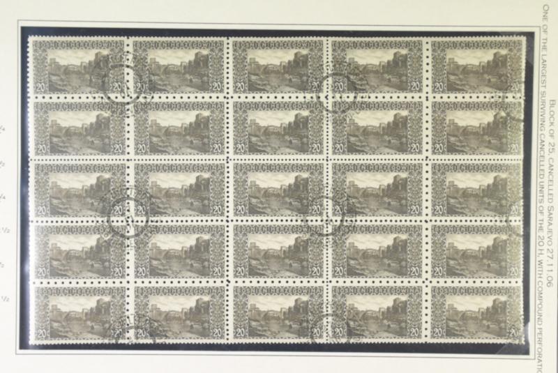 Bosnia and Herzegovina, Michel 35G used, 20h Narenta bridge, Mostar. Block of 25, with compound perforations cancelled Sarajevo 27.11.06. One of the largest units of the compound perforations. Ex. Gilberg. (Image1)
