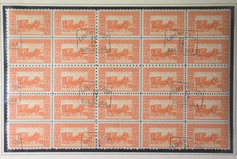 Bosnia and Herzegovina, Michel 39G used, 40h Orange post diligence. Block of 25 with compound perforation. Cancelled Banjaluka 27.11.06. Allegedly the largest known unit. Ex Gilberg. Exhibition item! (Image1)