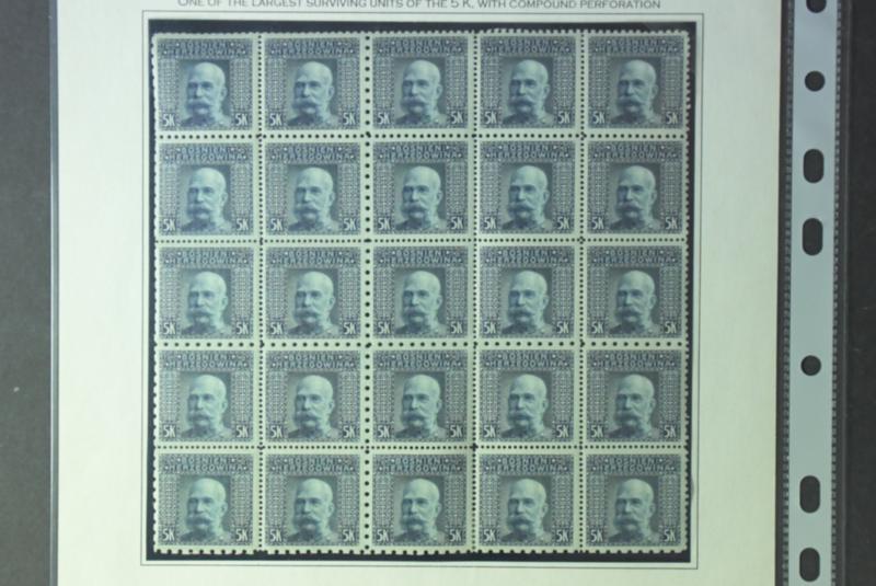 Bosnia and Herzegovina, Michel 44G **/*, Franz Joseph II 5kr Block of 25 with the mixed perforation, some split perfs. Two mint and 23 MNH stamps. One of the largest known units with compound perforation. Ex. Gilberg. (Image1)