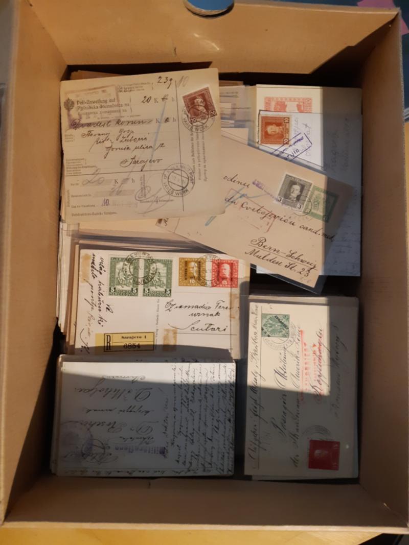 Bosnia and Herzegovina, Cover collection/accumulation 1890s–1910s in shoe box. Several hundred postcards, postal stationery cards incl. unused and some covers with overprint issues. Incl. some better, e.g. censor, registration and a money order. Looks interesting. 4 more images are available at www.philea.se (Image1)