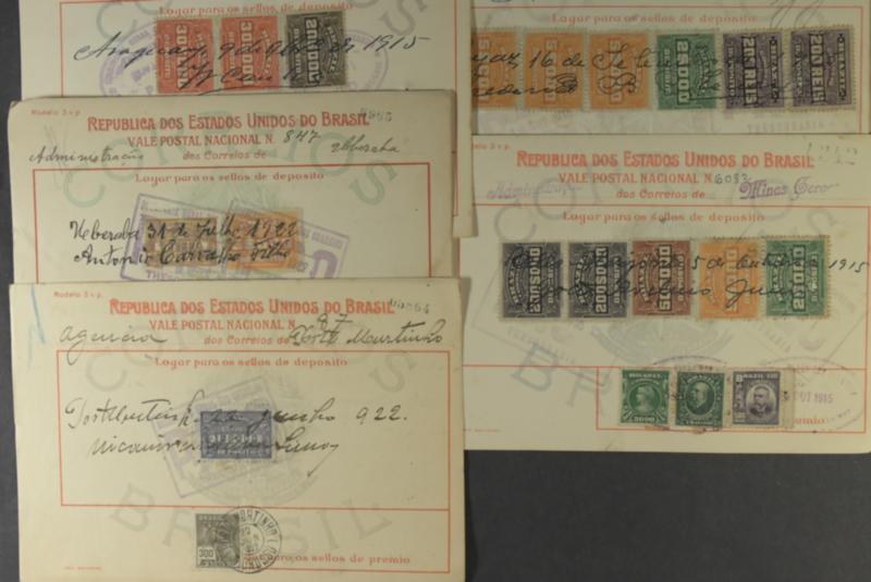 Brazil, Revenues accumulation. In envelope, postal money orders with revenue and postage stamps. 46 cards and 229 stamps. 1 more image is available at www.philea.se. (Image1)