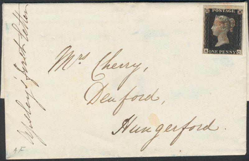 Britain, SG 2 cover, One penny black four margins tied with faint red maltese cancel. £750 (Image1)