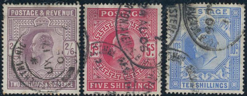 Britain, Michel 115-17 used, 1902 King Edward VII 2s. 6d, 5 s and 10 s perf 14, watermark anchor. 10s damaged upper left corner. EUR 390 (Image1)