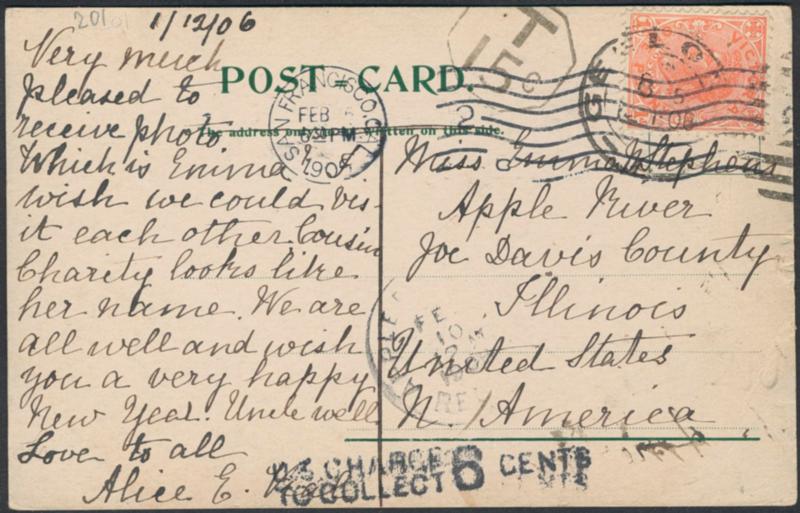 Australia, , Post card sent to USA 1906 withinsuffient franking 1 d. postage due collecte twice. With SURCHARGE TO COLLECT 6 cents chop, and again (unclear) in Apple River 15 c. Unusual. (Image1)