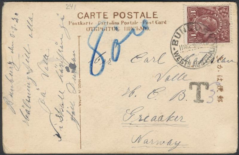 Australia, , Post card sent to Norway 1920 franked with 1½ d. Postage due 8 öre. (Image1)