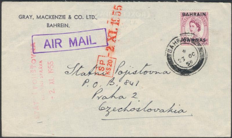 Bahrain, Michel 86 cover, Air mail sent to Czechoslovakia 1955 franked with 6 annas. Two different red censor chops. (Image1)