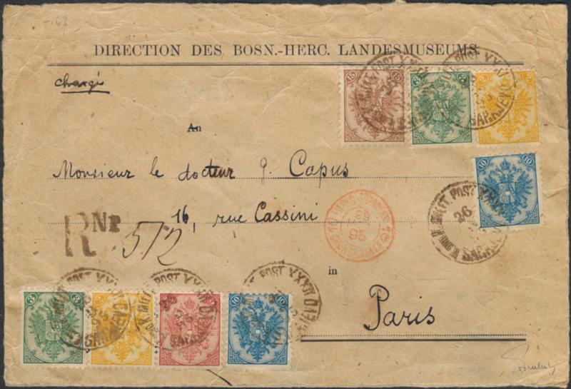 Bosnia and Herzegovina, Michel 2–6 I cover, 2×2+2×3+5+2×10+15 Kr as nice five colour franking on rare registered cover front sent from K and K MILIT. POST XXXII SARAJEVO 26.3.95 to France. Red arrival pmk PARIS 29.MARS.95 on the front. Letter slightly creased. Beautiful and rare show piece. Certificate Ferchenbauer (1995). 1 more image is available at www.philea.se. (Image1)