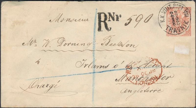 Bosnia and Herzegovina, Michel 2 I, 3 I cover, 3×1+3×3 Kr on stamped envelope 5 Kr, sent registered from K.K. MILIT. POST VIII TRAVNIK 22.10.88 to MANCHESTER 26.OC.88. The cover is somewhat strengthened and with small traces of mounting, nevertheless a fantastic postal stationery item. 1 more image is available at www.philea.se. (Image1)