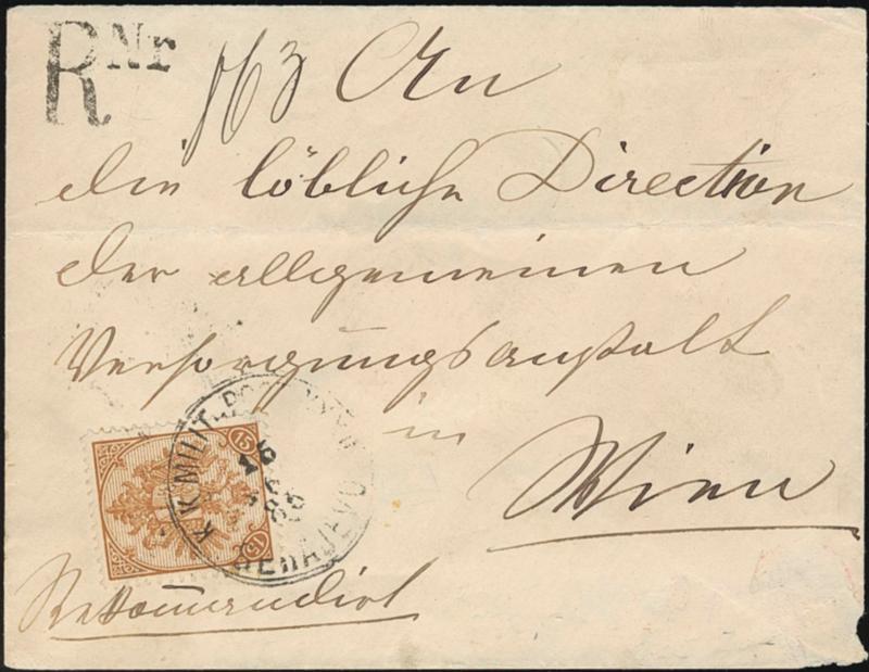 Bosnia and Herzegovina, Michel 6 I cover, 15 Kr. brown, single franking on registered cover from K.K.MILIT. .. SARAJEVO 15/6 86 to WIEN 18.6.86. The cover with tiny paper loss. (Image1)