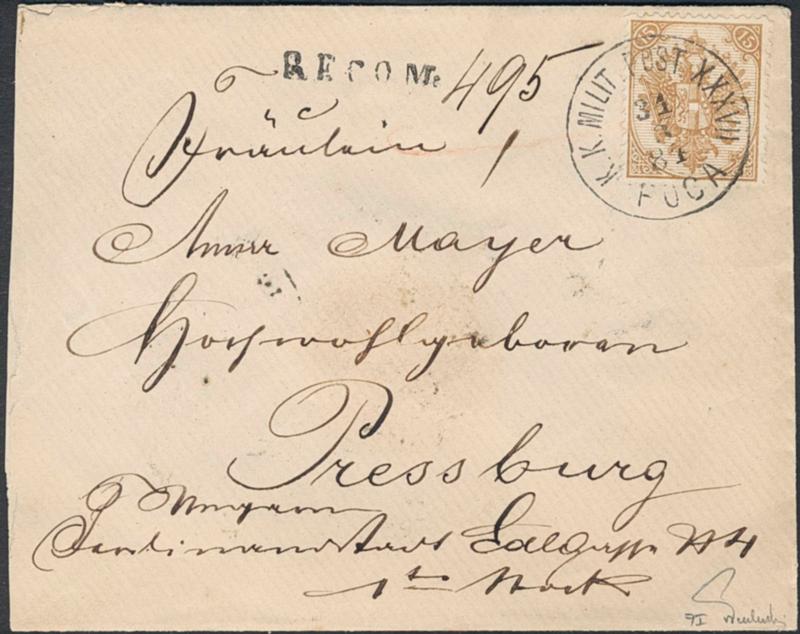 Bosnia and Herzegovina, Michel 7 I cover, Double eagle 15 Kr brown on registered cover sent from K.K. MILIT. POST XXXVII FUCA 31.3.84 via SARAJEVO 3.4 to Bratislava. Rare. Kurzbefund Ferchenbauer 'Kabinettstück' (2002). 1 more image is available at www.philea.se. (Image1)