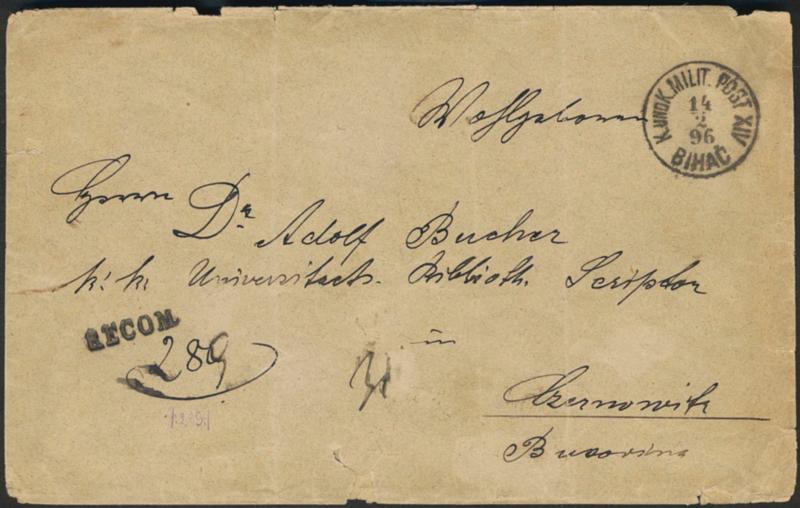 Bosnia and Herzegovina, Michel 8 cover, 20 kr olive-green, single franking on reverse of 2-fold registered letter sent from K. und K. MILIT. POST. XIV BIHAC 14.2.96 to CZERNOWITZ STADT 18.2.96. Somewhat worn. Certificate Dr.Velickovic. 2 more images are available at www.philea.se (Image1)