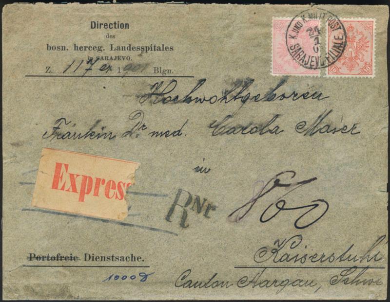 Bosnia and Herzegovina, Michel 13, 15, 16 cover, 5+2×10+4×20 h as higher franking on registered special delivery cover sent from K. und K. MILIT. POST SARAJEVO FILIALE 24.1.01 to Switzerland, with arrival pmk on the reverse. The cover has been cut open on all sides for display, then resealed at the lower edge. Depicted in Ferchenbauer IV p. 232. Certificate Ferchenbauer 'wirkungsvolles rel. Prachtstück dieses sehr seltenen Beleges' (2007). Nice show piece. 2 more images are available at www.philea.se (Image1)