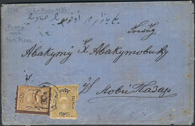 Bosnia and Herzegovina, , Turkish P.O.: BOSNA on cover dated '1874' with 20 Pa brown postage due issue and 1 Pia yellow (def.), both 1870 issue, sent to Novi Pazar. Sender's cachet on the reverse. Slightly aged otherwise fine. Scarce. (Image1)