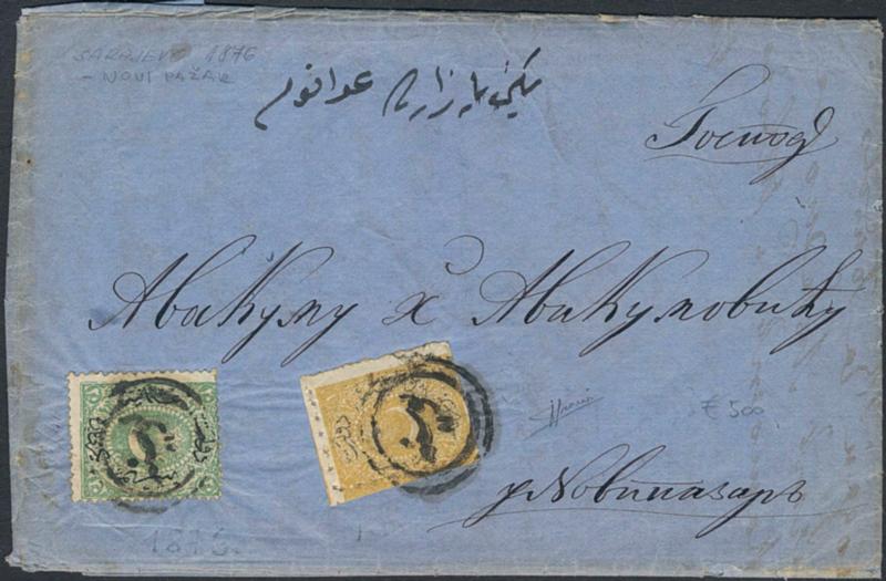 Bosnia and Herzegovina, , Turkish P.O.: 1 Pia. yellow 1871 issue and 20 Pa. 1868 issue on folded envelope, cancelled by Arabic 'Bosna 81' cancellations, sent to Yenipazar (Novi Pazar). Somewhat worn and aged, otherwise very fine and scarce. (Image1)