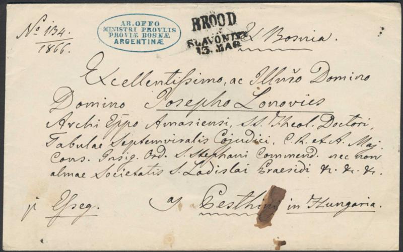 Bosnia and Herzegovina, , Postage-free cover sent from Sarajevo via BROOD 13.MAR (Slovenia) and ESSEG 14.3 to PEST 16.3 (Hungary). The sender is the Provincial of the Franciscan Order, who named the order's province Bosna Srebrena, in Latin Bosna Argentina. Small ink stain, otherwise very fine. (Image1)