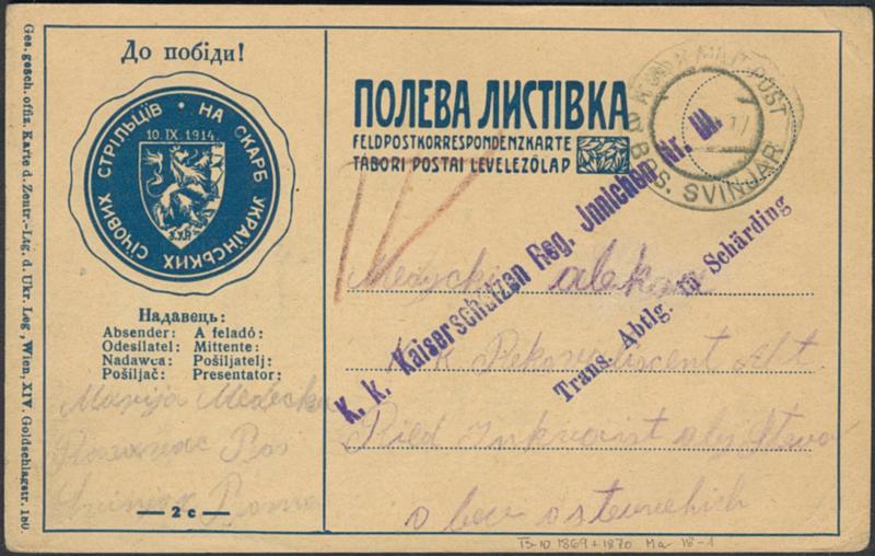 Bosnia and Herzegovina, , Field postal card of the Ukrainian Legion in Bosnia cancelled from K. und K. MILITÄR-POSTAMT BOS. SVINJAR, sent to Ried/Innkreis. With two single-liners K. k. Kaiserschützen Reg. Innichen Nr. III and Trans. Abtlg. in Schärding. Unusual combination. (Image1)