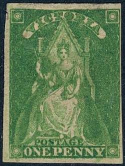 Australia, Victoria, SG 40 *, Queen-on-throne 1d Yellow-green. Right margin close cut. £325 (Image1)