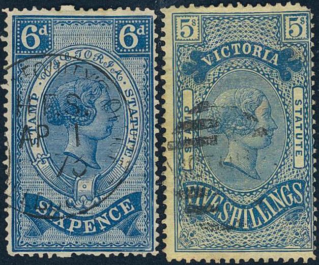 Australia, Victoria, SG 223, 227 used, the 6 d and 5/- used of the 1884 series. The former cds and the latter neat oval line pmk. 5 s with a upper right short corner. £160 (Image1)