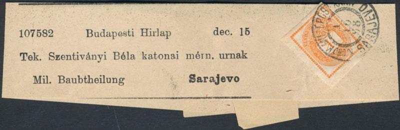 Bosnia and Herzegovina, , 1898 Hungarian Newspaper stamp 1 k orange-red imperf, wmk 2 (Mi 53X) on Newspaper wrapper, cancelled upon arrival with military postmark SARAJEVO 1.10.98. Scarce. (Image1)
