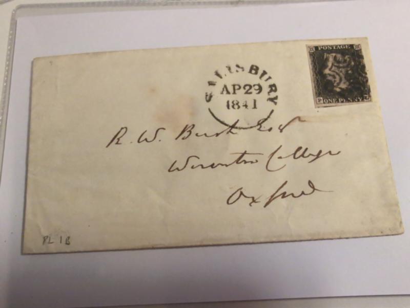 Britain, SG 2 cover, One penny black cover to oxford. Black Maltese cancel and Salisbury AP 29 1841. Backstamped Oxford AP 30 (1841) noted as plate 1b, average margins. £750 1 more image is available at www.philea.se. (Image1)