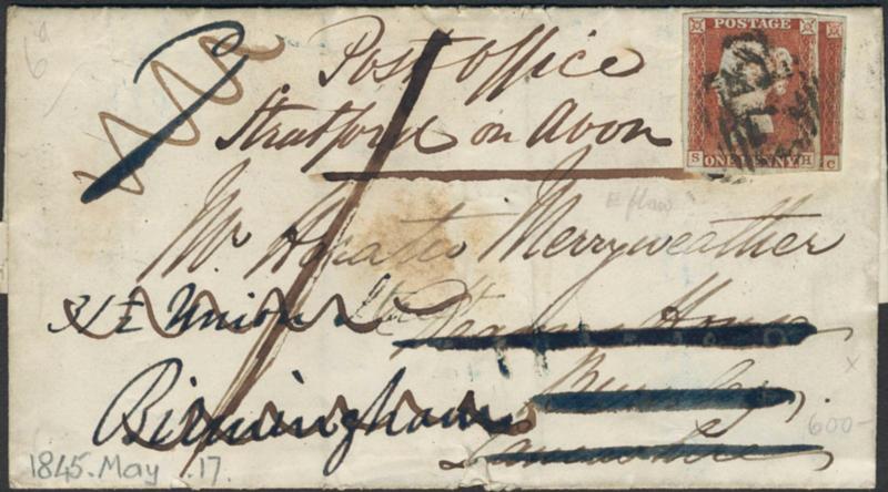 Britain, Michel 8 cover, Cover sent to Birmingham re-directed to 'Post Office' Stratford upon Avon with extra fee paid by an extra stamp partly affixed on top of the original stamp. With several cancels on the back. 1 more image is available at www.philea.se. (Image1)