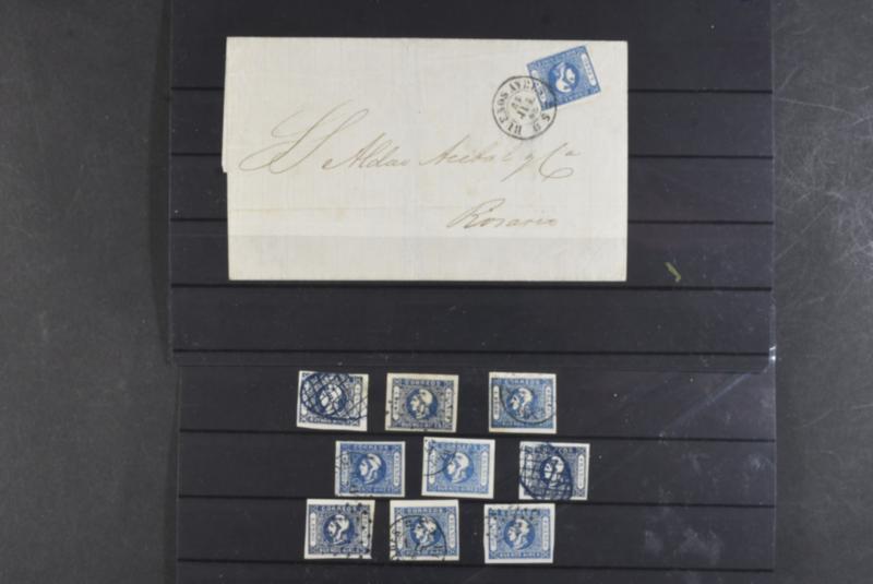Argentina, Buenos Aires, Mostly used. A Study of the Liberty Head issues incl. superb 1 peso blue on cover and the superb different types 1 peso blue x15, 1 peso rose x12 and also the 4 reales green x4 + block of four black proof and axtraordinary 4 reales wing marginal in blue. Tip-top quality! . 2 more images are available at www.philea.se (Image1)