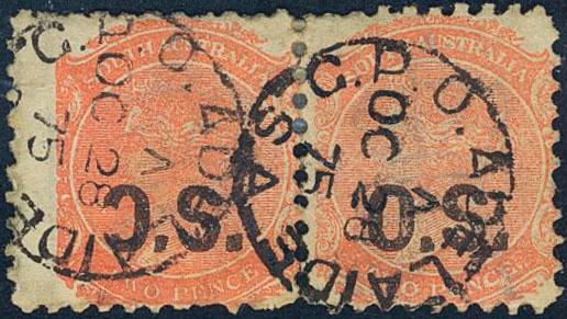 Australia, South Australia, Official Michel 8 used, 1874 O.S. overprint on 2 p Queen Victoria in pair. One with broken "O" variety, recent discovery. (Image1)