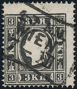 Austria, Michel 11 II b used, 1859 King Franz Joseph 3 Kr black-grey type II. Off-centered. EUR 650 (Image1)