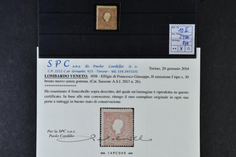 Austria, Lombardia-Venetia, Michel 10 II (*), 1858 Emperor Franz Joseph 10 So lilac-brown type II. Cert by SPC 2014. EUR 2400 (Image1)