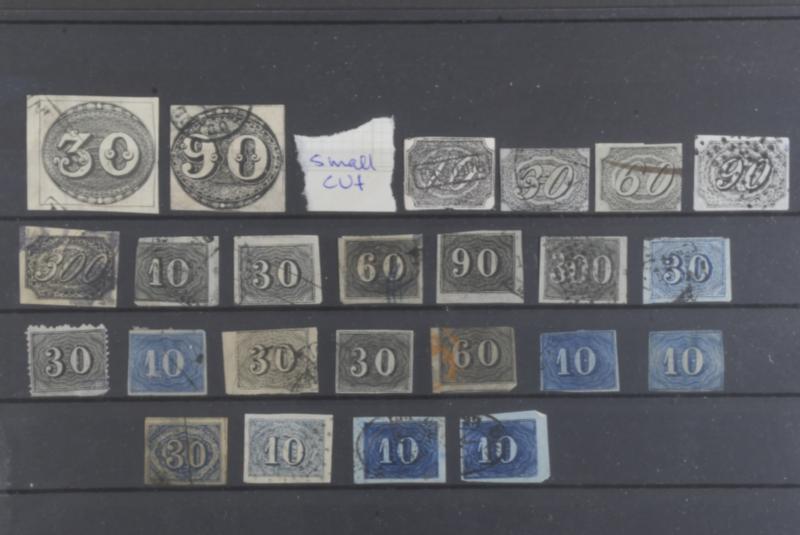 Brazil, Used lot 1843–1860 on stock card. Study lot with genuine, fakes and forgeries. The entire lot is presented at www.philea.se. Mixed quality (24) (Image1)