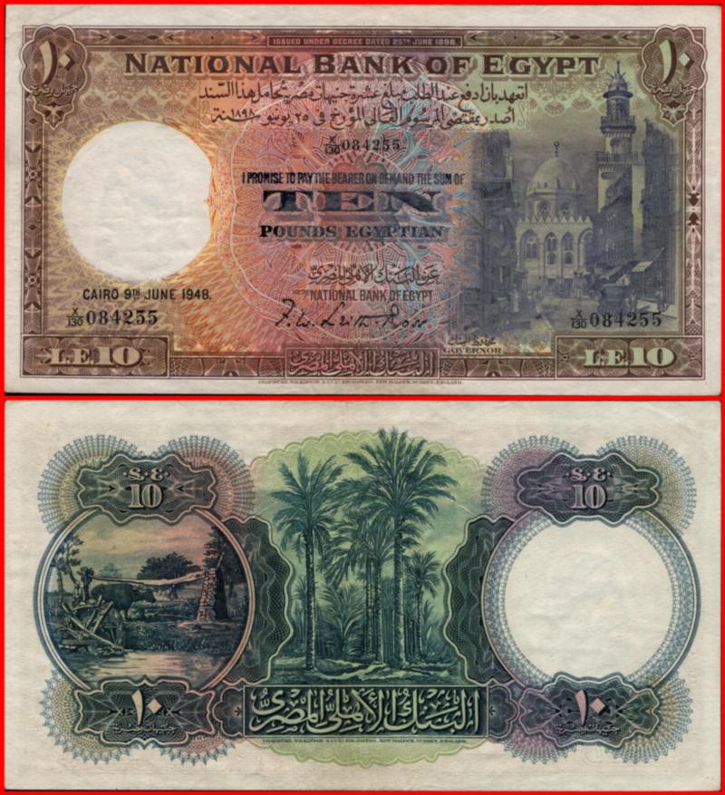 Egypt 1948, National Bank Pick # 23 £10 CAIRO 9rd JUNE 1948 S/N x/130 084255. AU (Image)