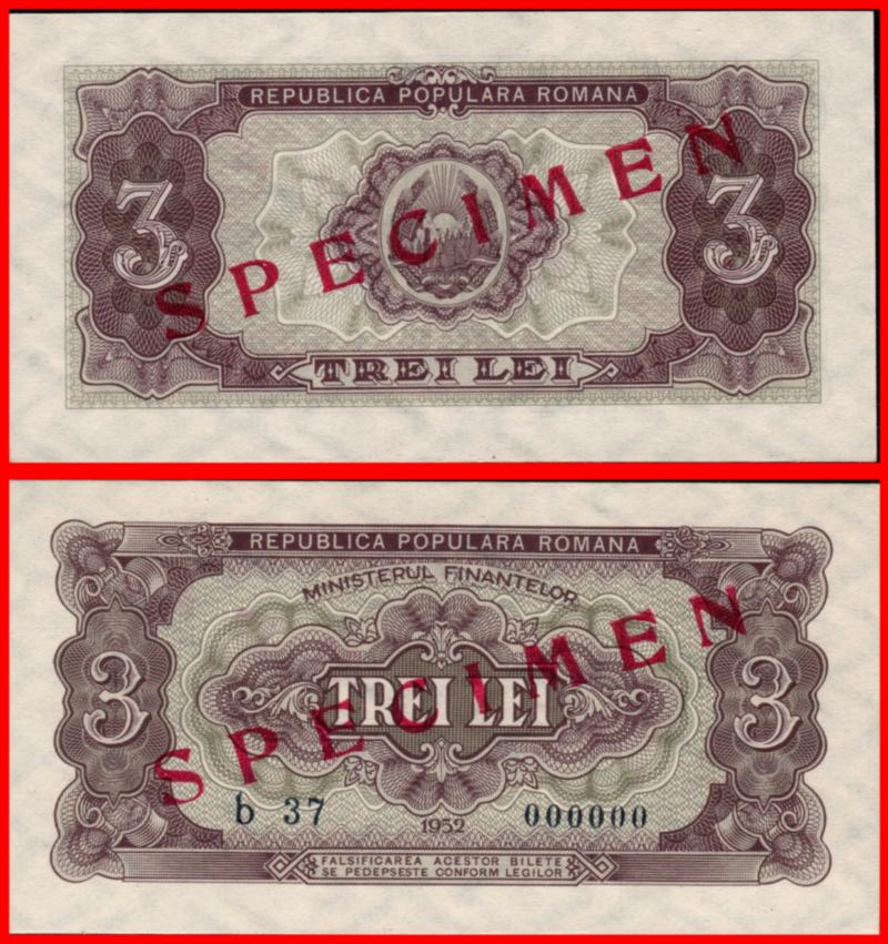 3 Lei Unc Specimen Banknote From Romania 1952 Pick-82s Very Rare (Image)