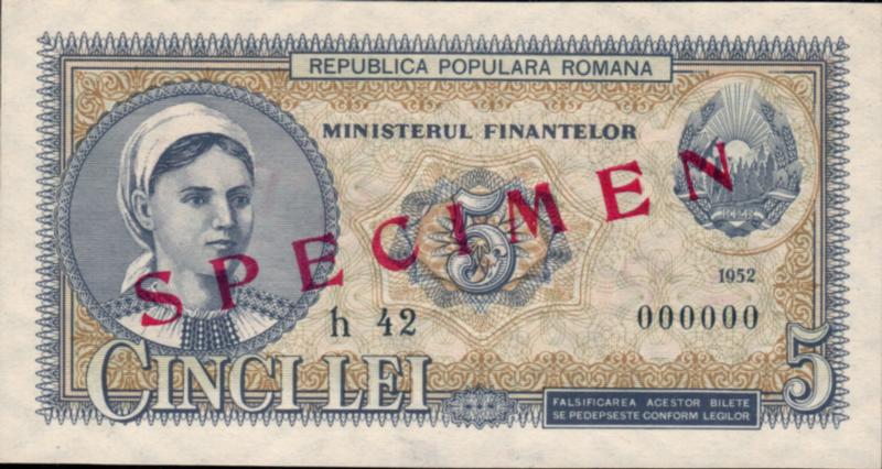 5 Lei Unc Specimen Banknote From Romania 1952 Pick-83s Very Rare (Image)