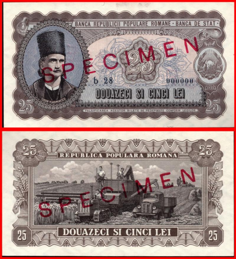 25 Lei Unc Specimen Banknote From Romania 1952 Pick-85s Very Rare (Image)
