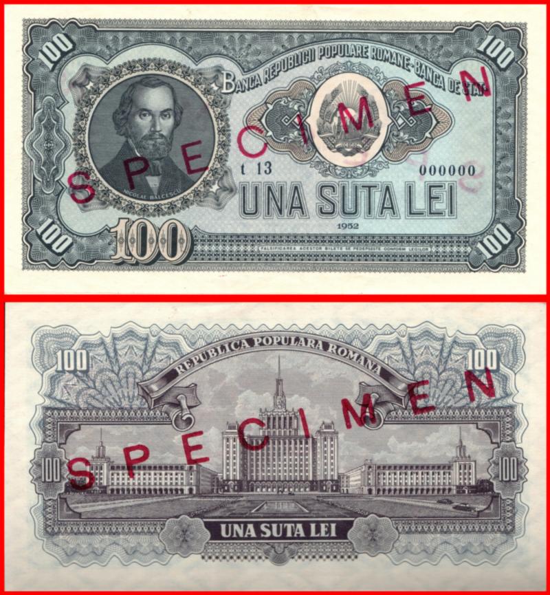 100 Lei Aunc Specimen Banknote From Romania 1952 Pick-86s Very Rare (Image)