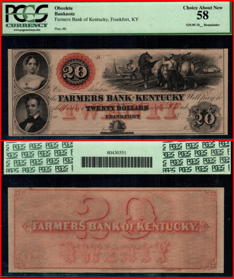 USA CERTIFIED CURRENCY / Obsolete Bank Notes / 1859 PCGS Choice About New 58. $20 KENTUCKY, FRANKFURT OBSOLETE BANK NOTE. Plate #B. (Image)