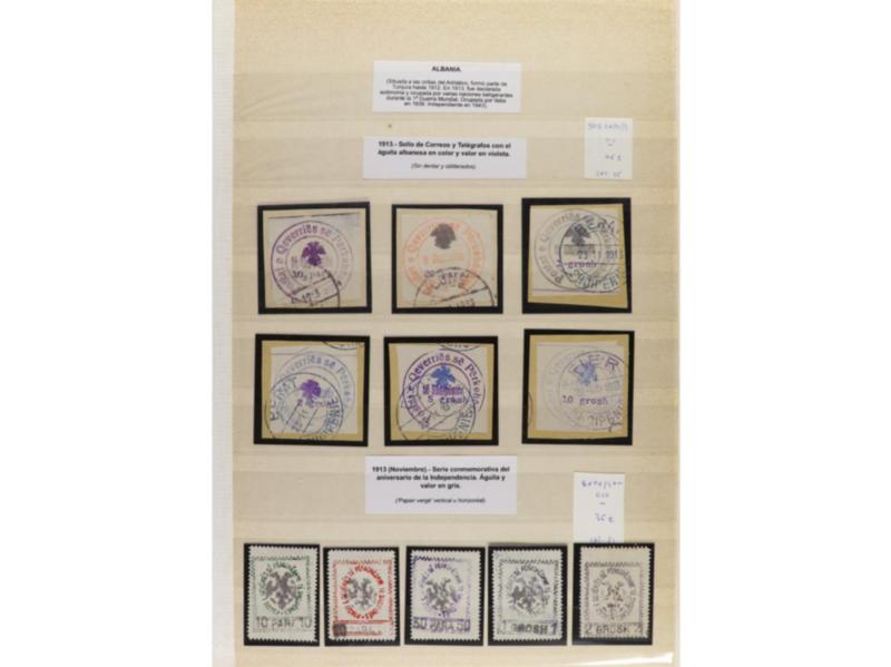LOTES y COLECCIONES. ALBANIA. Conjunto montado en hojas clasificador entre 1913 y 1936 aprox. con sellos y series en nuevo y usado. Incluye aéreos e interesantes cartas. Hay ejemplares de valor. Alto valor en catálogo. Ver fotos en web. (Image1)