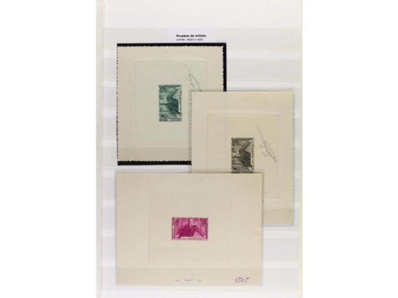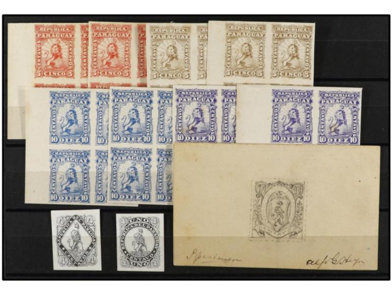 LOTES y COLECCIONES. 1879-1881. PARAGUAY. Conjunto de pruebas: 1879, 5 centavos rojo, 2 bloques de cuatro, 5 centavos castaño claro, 2 bloques de cuatro, 10 centavos azul, 2 bloques de cuatro y 10 centavos lila, 2 bloques de cuatro, TODOS EN PAPEL CARTÓN. 1881: 1 y 4 centavos pruebas en negro sobre PAPEL CARTÓN y proyecto a lápiz de 10 centavos. RARO conjunto. (Image1)