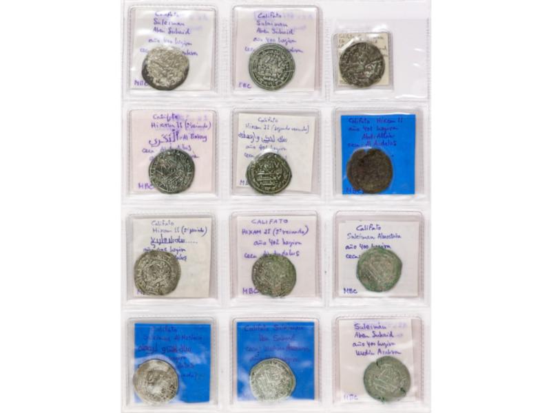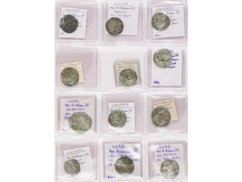 Lote 12 monedas. (5) Dirhams emirales en AR, entre ellas destacan un dirham de ABDERRAHMAN I con fecha 153 H y un dirham de MUHAMMAD I con fecha 258 H con grieta central; (2) feluses emirales en AE, (2) dirhams califales en AR; incluye también (3) jetones o fichas reproduciendo monedas almoravides. A EXAMINAR . BC+/MBC.(Image1)