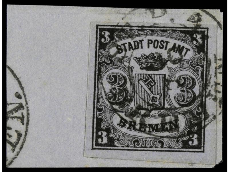 ALEMANIA ANTIGUOS ESTADOS: BREMEN. 1855. 3 g. negro sobre pequeño fragmento tipo II (Mi. 1y). PRECIOSO. Dictamen T. Neumann. Yv.1Aa. (Image1)
