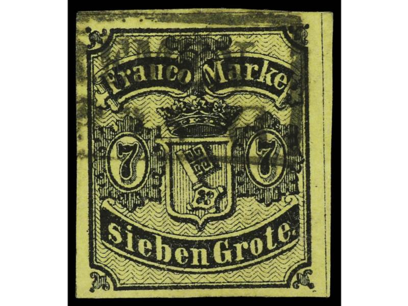 ALEMANIA ANTIGUOS ESTADOS: BREMEN. 1855-61. 7 gr. negro s. amarillo. MUY BONITO. Cert. C. HEITMANN. Yv.3. (Image1)