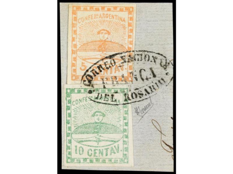 ARGENTINA. 1858. 5 ctvos. rojo y 10 ctvos. verde sobre fragmento. Mat. ovalado CORREO NACIONAL / DEL ROSARIO. PRECIOSO. Cert. A. SOLARI. Yv.1, 2. (Image1)