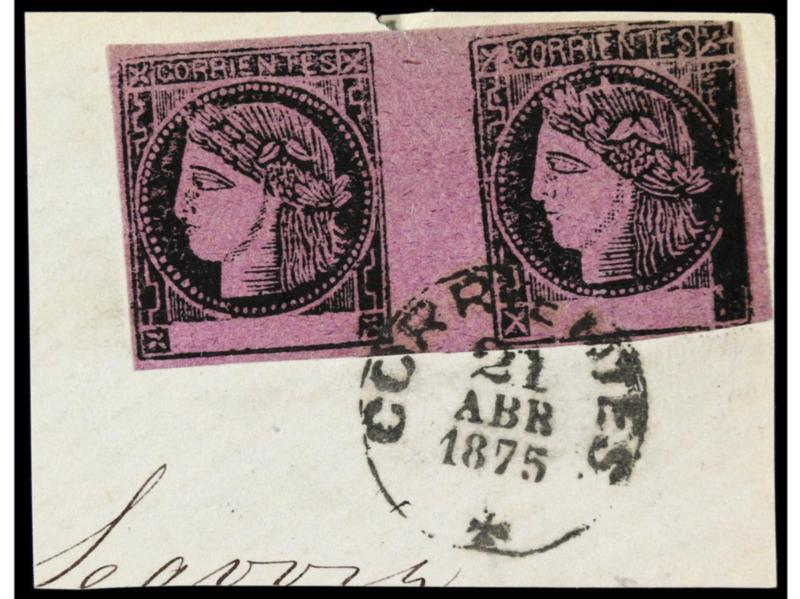 ARGENTINA. 1875. CORRIENTES. (3 ctvos.) lila rosa, pareja sobre fragmento. Mat. fechador de CORRIENTES. MUY BONITO. Yv.8a (2). (Image1)