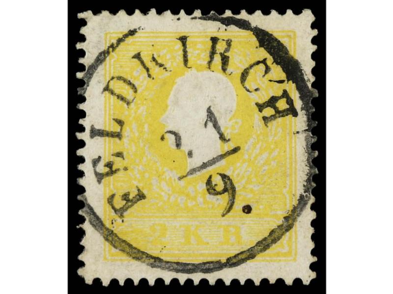 AUSTRIA. 1858-59. 3 kr. amarillo, Tipo I. Mat. fechador FELDKIRCH. LUJO. Dictamen U. Steiner. Yv.6. (Image1)