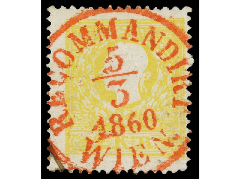AUSTRIA. 1858-59. 2 kr. amarillo, Tipo II. Mat. fechador RECOMMANDIRT / WIEN en rojo. LUJO. Yv.11. (Image1)