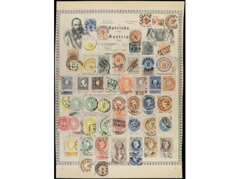 AUSTRIA. 1850-80. Cuatro páginas de álbum con sellos usados con preciosos matasellos, también sellos de Levante Austríaco y Enteros Postales. Nueve dictámenes FERCHENBAUER. (Image1)